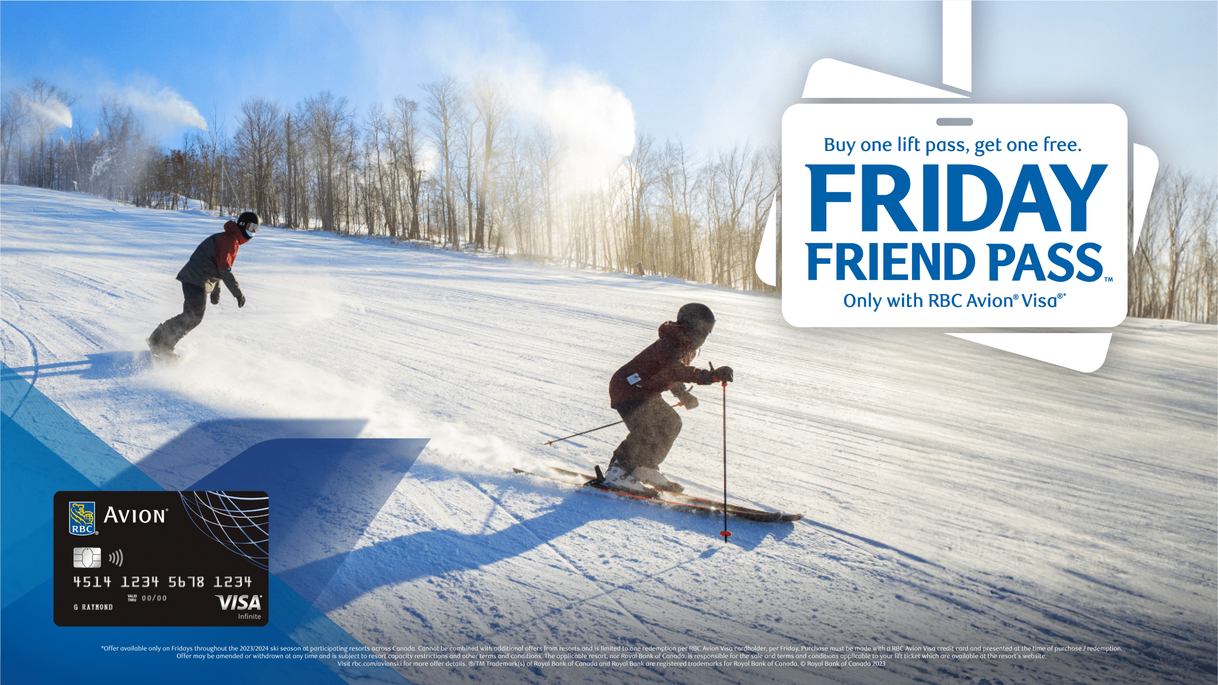 Offer available only on Fridays throughout the 2023/2024 ski season at participating resorts across Canada. Cannot be combined with additional offers from resorts and is limited to one redemption per RBC Avion Visa cardholder, per Friday. Purchase must be made with an RBC Avion Visa credit card and presented at the time of purchase / redemption. Offer may be amended or withdrawn at any time and is subject to resort capacity restrictions and other terms and conditions. The applicable resort, nor Royal Bank of Canada, is responsible for the sale and terms and conditions applicable to your lift ticket which are available at the resort’s website. Visit rbc.com/avionski for more offer details.
