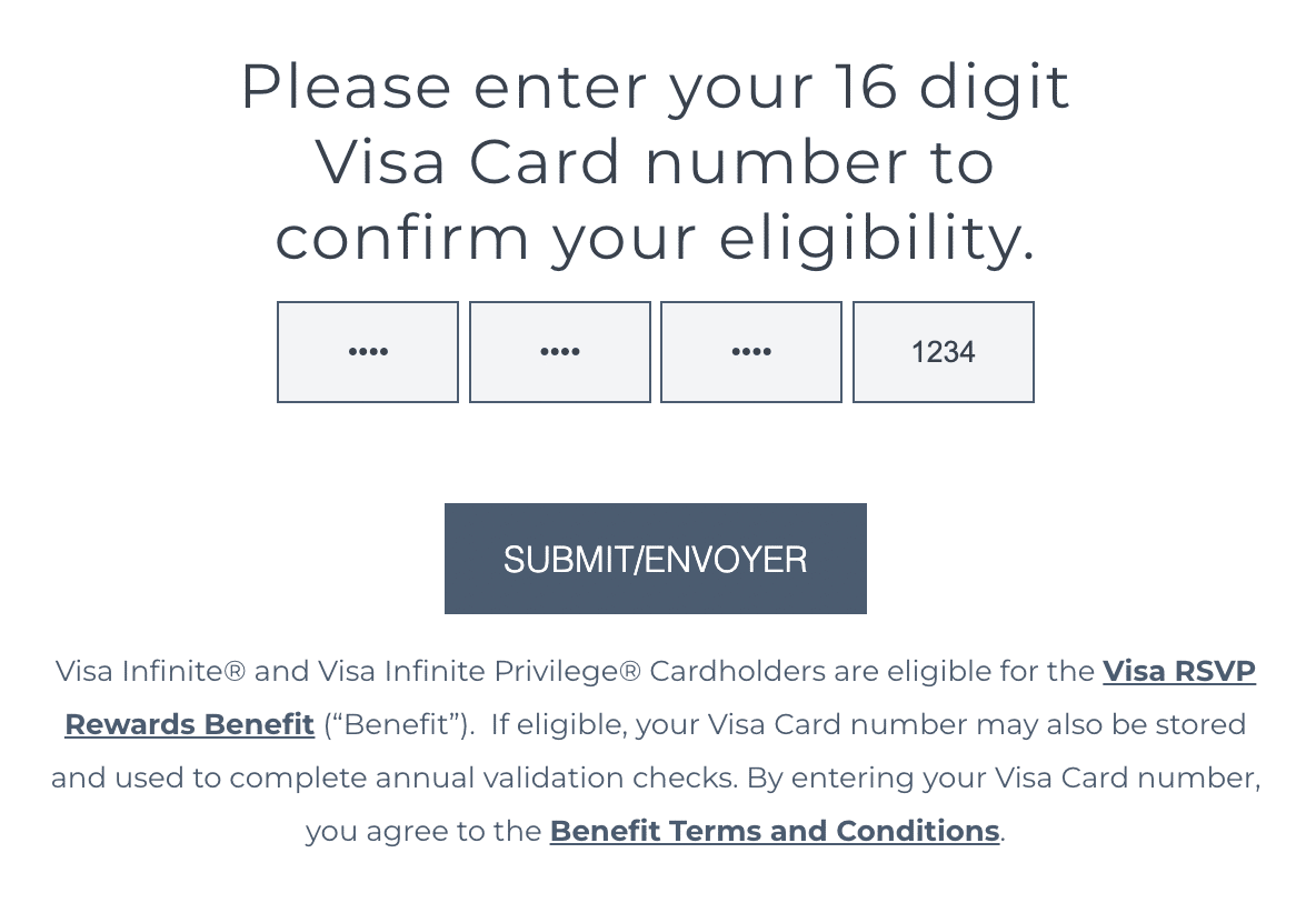 The process can then be completed relatively quickly. When making an RSVP Rewards account, there is a “check eligibility” button, where you can enter your Visa credit card number to confirm eligibility prior to completing your registration.