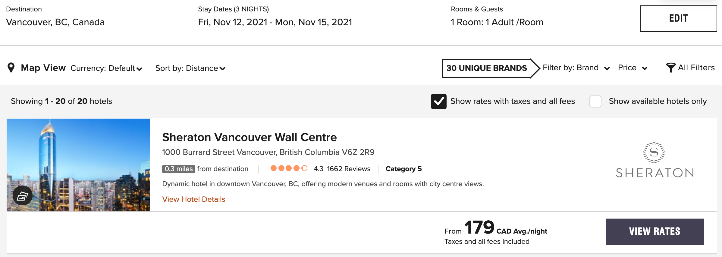Here’s an example for the Sheraton Vancouver Wall Centre, going for $189/night (including taxes and fees) on a November weekend: