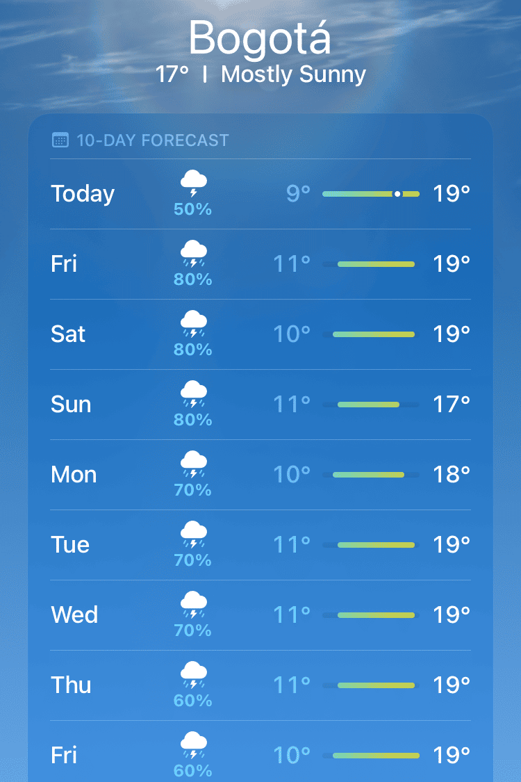 Bogotá gets tropical torrential downpours, intensified by the mountainous geography. When it rains, it’s punishing and relentless. Luckily, rain that heavy is unsustainable, and it’ll usually lighten up within an hour or two, if not clear up entirely.