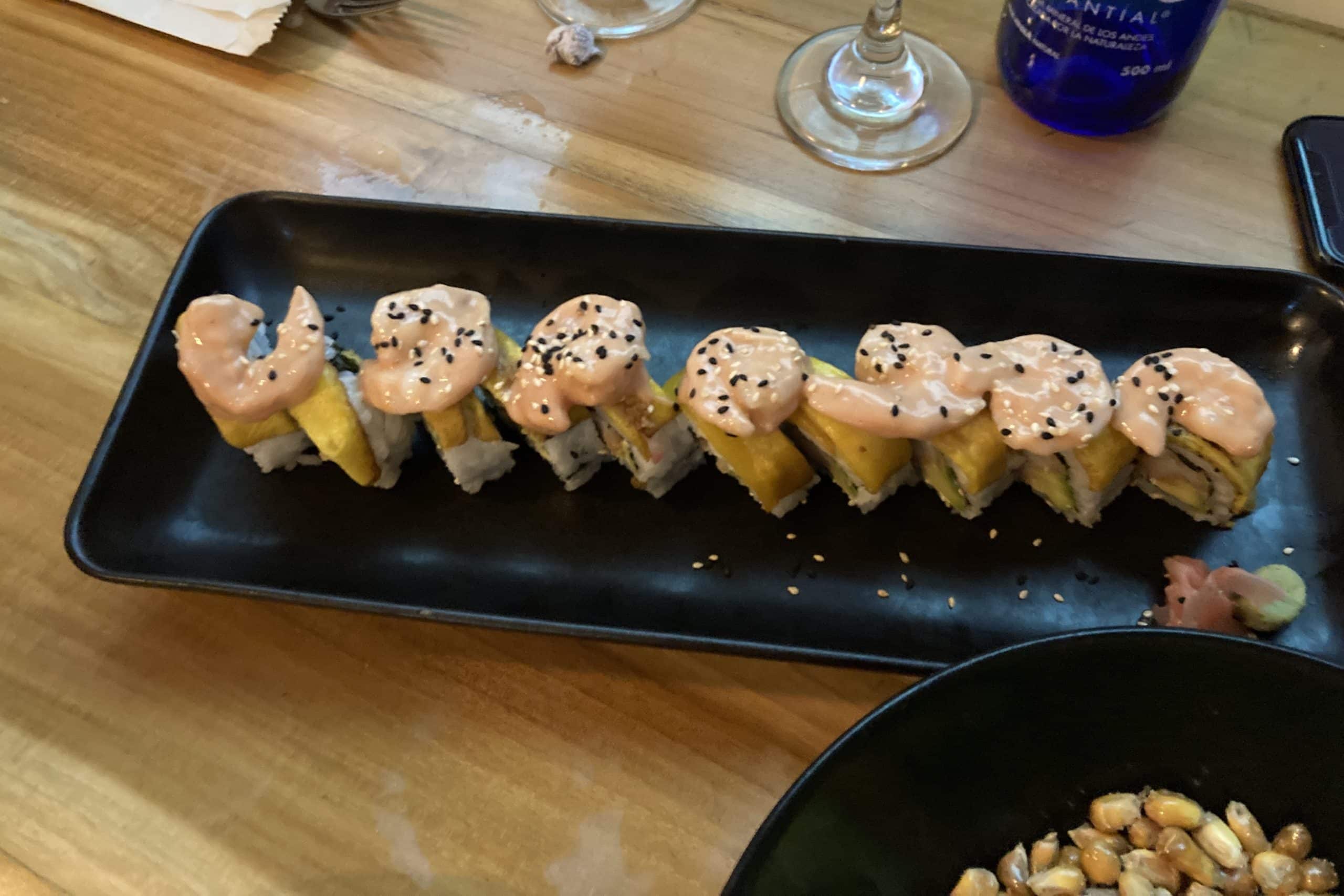 Additionally, we got a couple of sushi rolls, heavily featuring shrimp, as is the custom here. One roll featured plantain, which exceeded our modestly curious expectations.