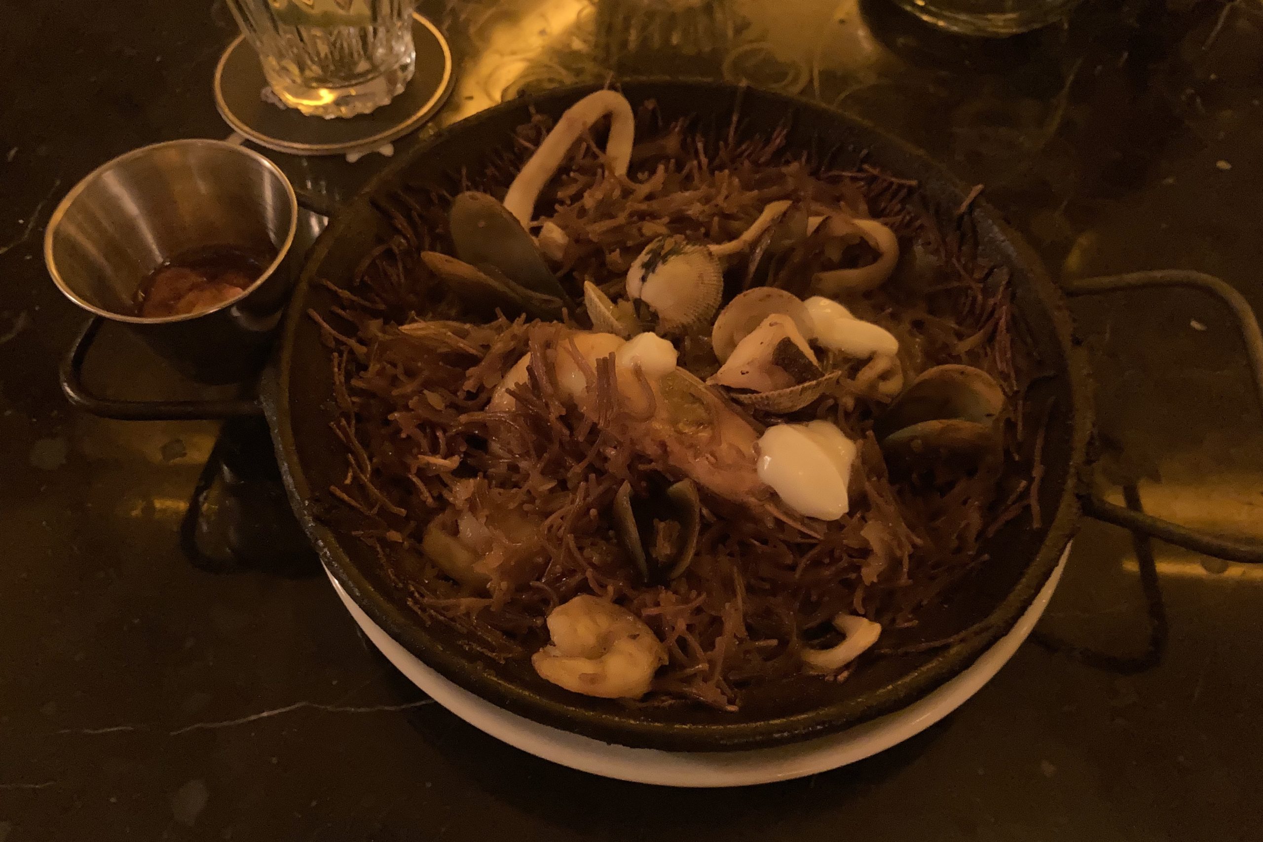 I also ordered fideuá de mariscos, a seafood wok consisting of octopus, squid, mussels, and shrimp. Fideuá is traditional to Valencia, Spain, a dish I had entirely forgotten about since I visited many years ago. It’s essentially paella made with noodles instead of rice.