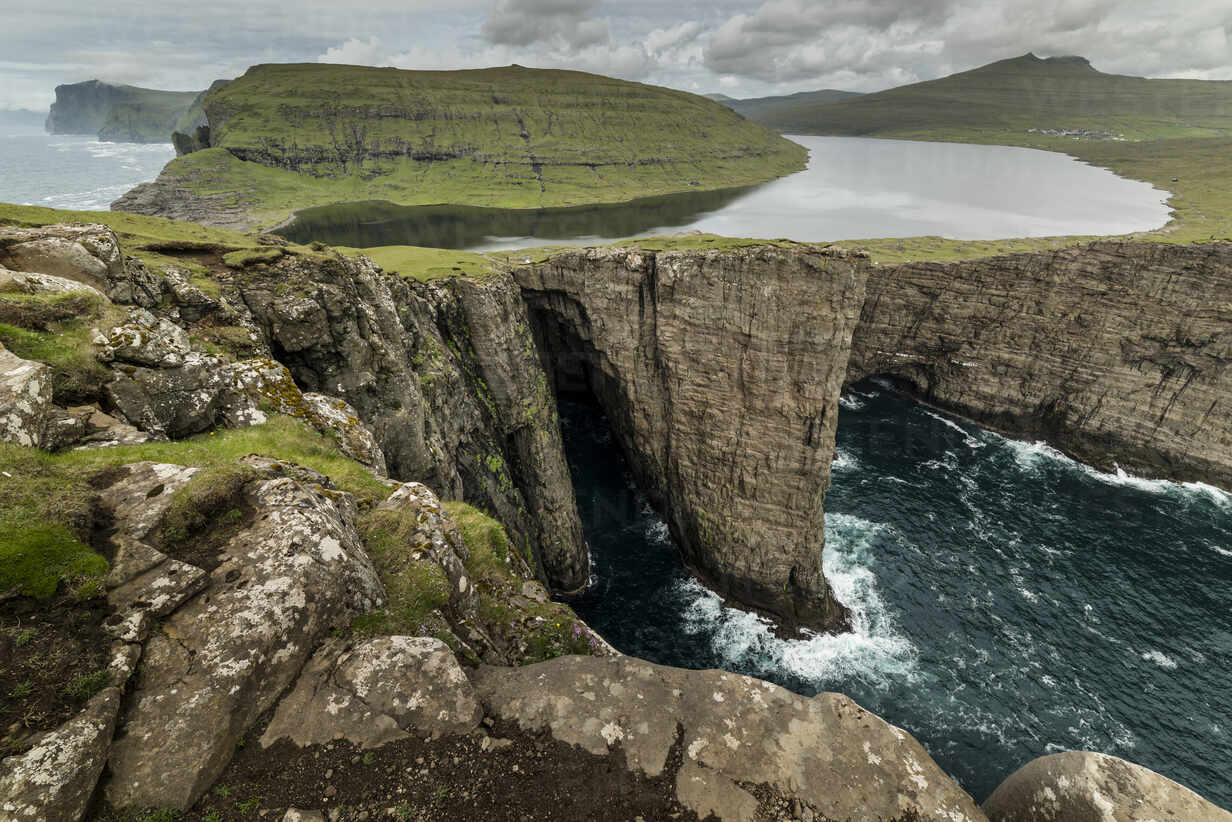 Quite remarkbly, the Leitisvatn lake also drains directly into the sea, albeit less dramatically than Múlafossur. However, the real point of interest here is a cliff called Trælanípa, where with good weather, you can find a view of Leitisvatn that resembles an optical illusion.