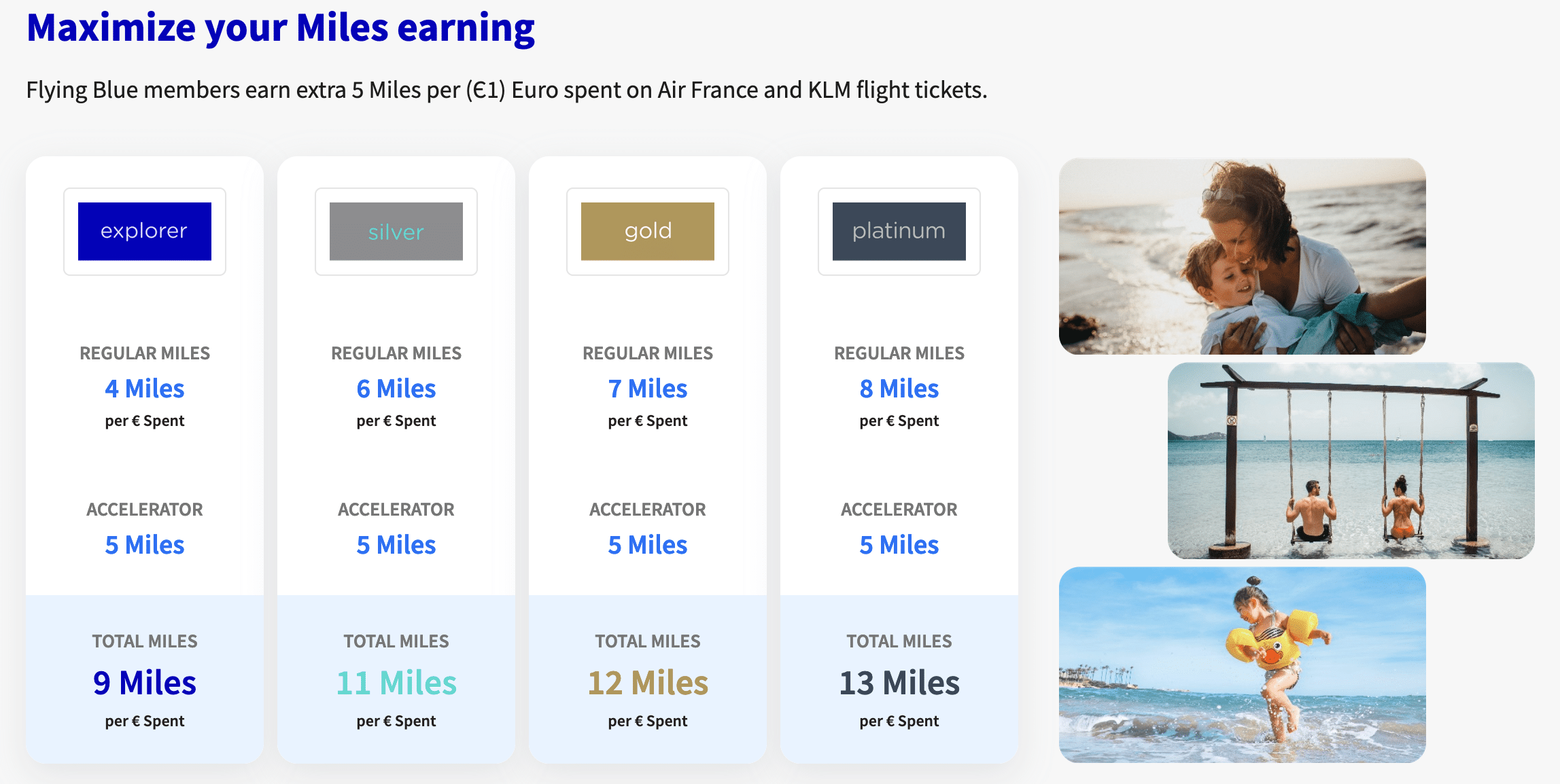As you can see from the above chart, with the miles accelerator feature provided by the card, you can earn up to 13 Flying Blue miles per euro spent on your Air France and KLM flights, depending on your membership status tier.