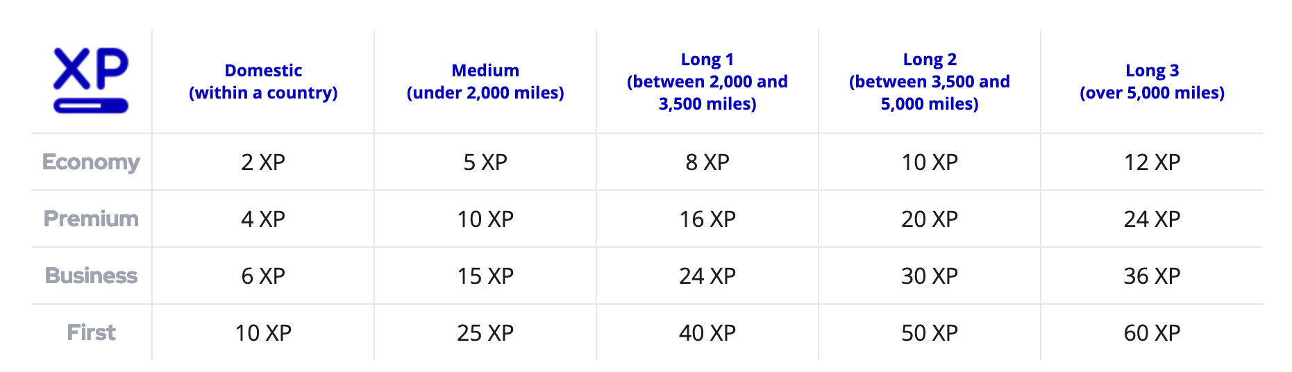 The number of XP you earn is based on the flight distance and cabin class, and it can range from 2XP for a one-way domestic economy flight, all the way up to 60XP for a one-way long-haul (over 5,000 miles) flight in First Class.