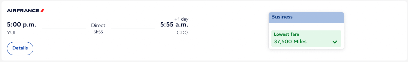 - Business class: 37,500 miles (from Montreal or Ottawa)