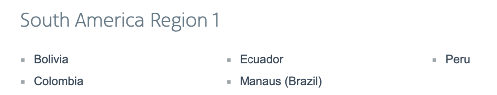One, the definition of “South America 1” is a lot more generous than what you’ll find with, say, Aeroplan’s “Northern South America” geographic zone. While Aeroplan’s definition only reaches Colombia and Ecuador (in addition to Guyana and Venezuela), American AAdvantage extends this relatively cheaper zone all the way to Bolivia, Peru, and northwestern Brazil.