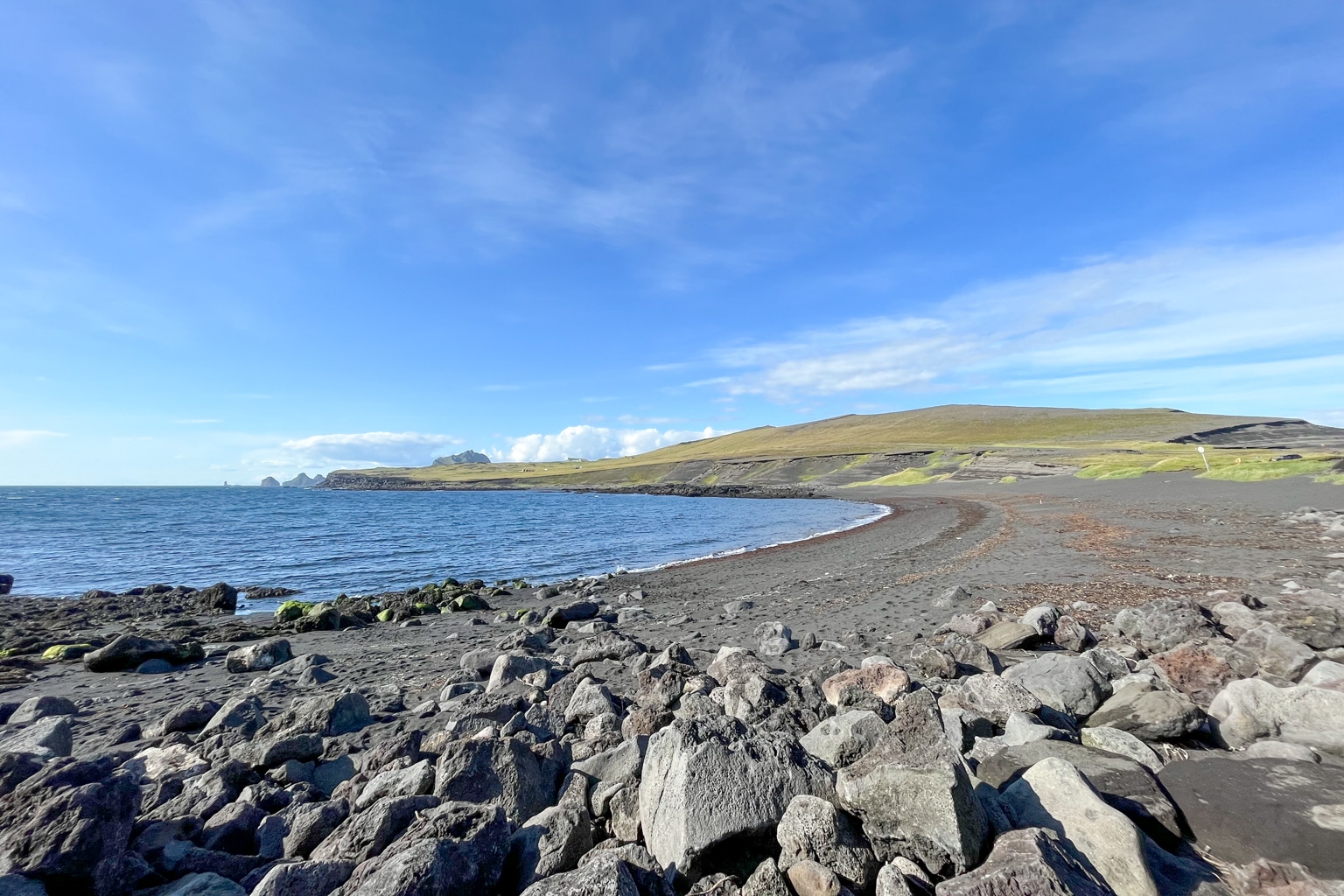 The main island, Heimaey, is the only inhabited island of the 15 islands. Currently, there are only around 4,000 residents, and most of the island is composed of rocky beaches and rolling green hills.