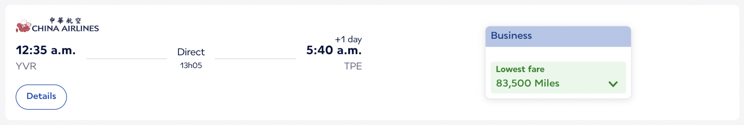 For example, you can fly from Vancouver to Taipei in China Airlines business class for 83,500 Flying Blue miles, plus $136 (CAD) in taxes and fees.