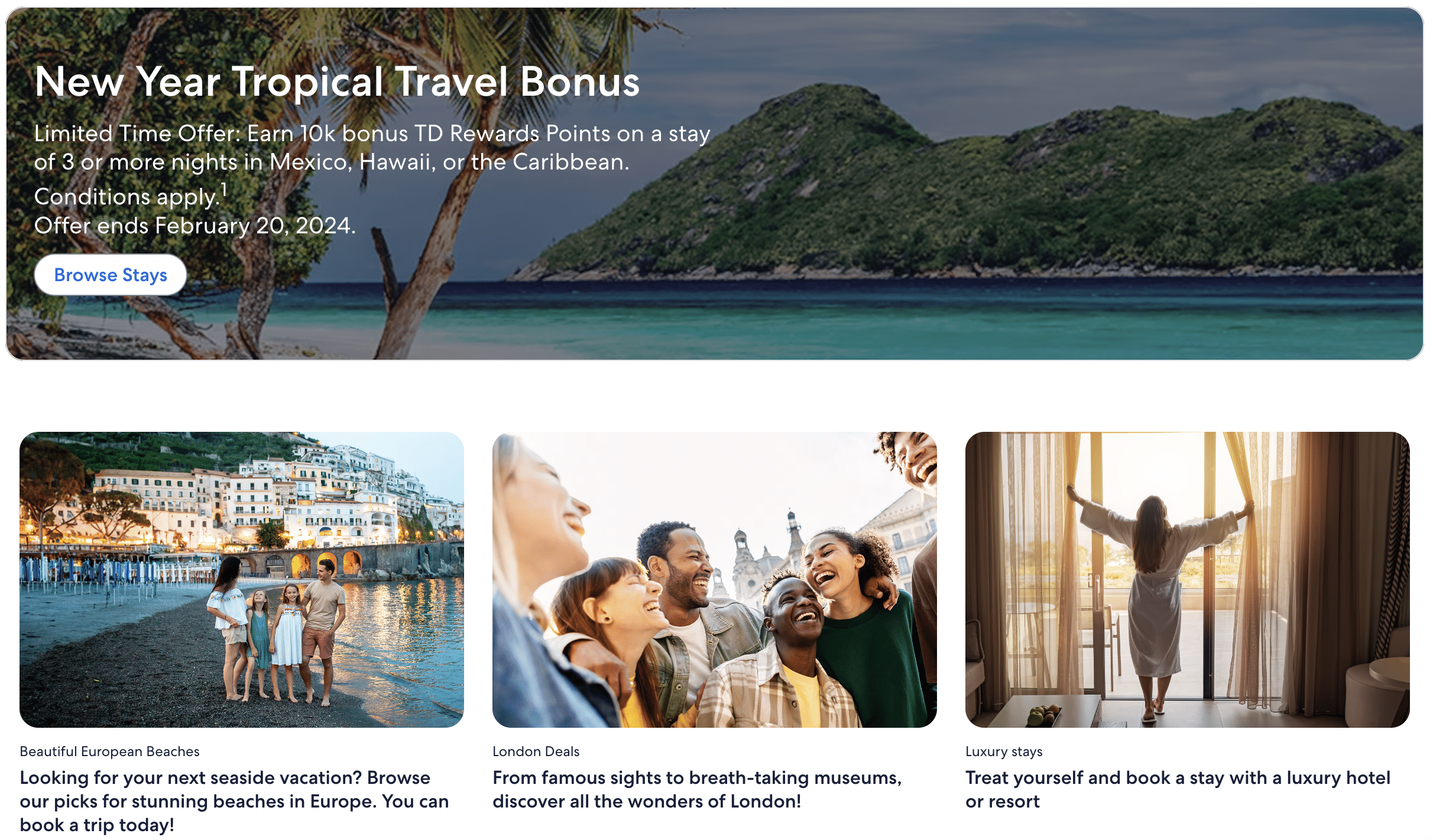 If you’d like to earn TD Rewards Points to put towards flights, hotels, short-term rentals, vacations, and more, be sure to check out the current offer on the TD First Class Travel® Visa Infinite* Card.