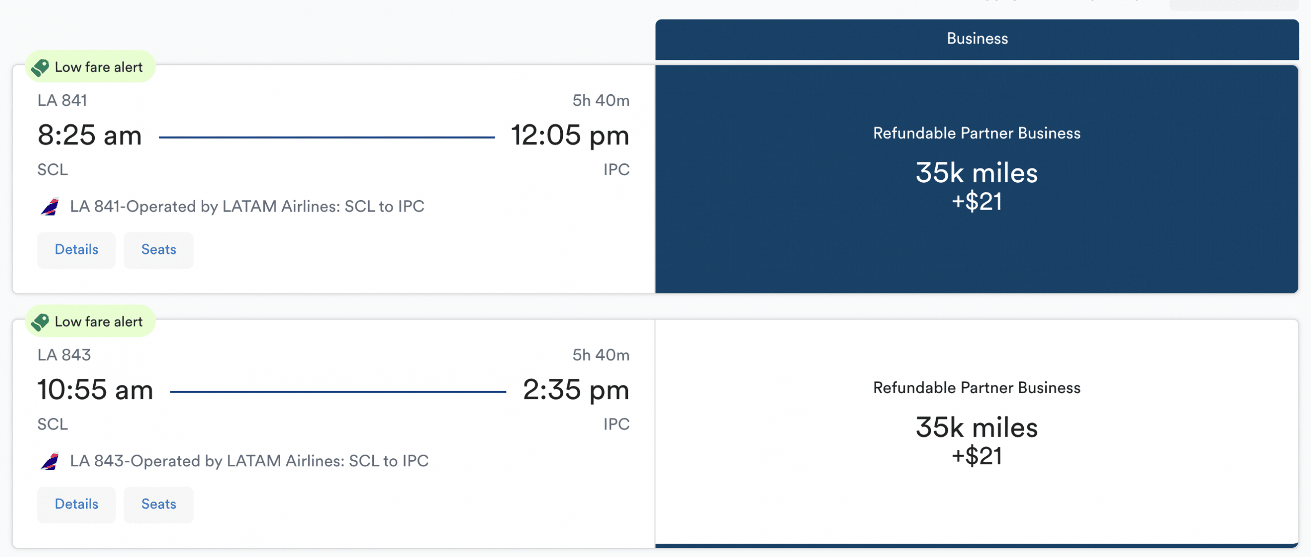 Through Alaska Mileage Plan, you’ll easily find business class tickets between Santiago and Easter Island for 35,000 miles per way, but you won’t find any economy awards.