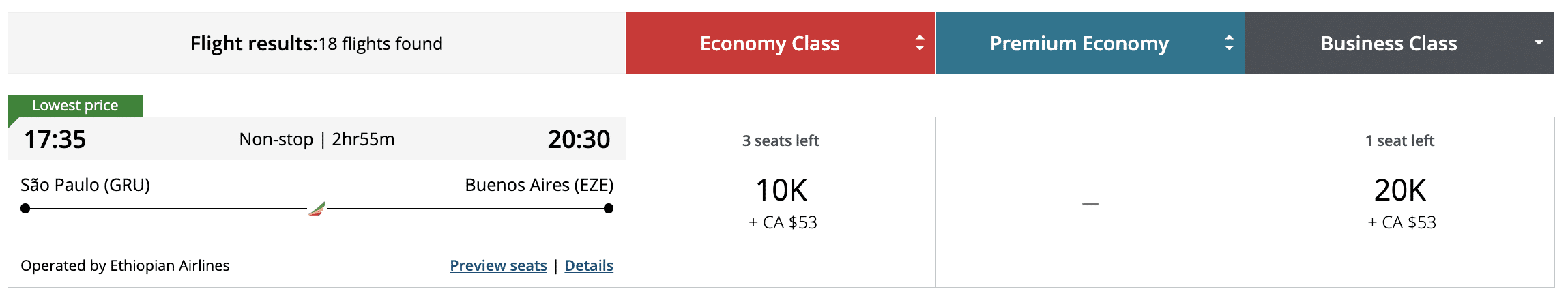 From Canada, your only direct option to Buenos Aires is with Air Canada, which only operates one flight a day from Toronto. This flight also stops in Sao Paulo (GRU), so the award redemption costs can be expensive.
