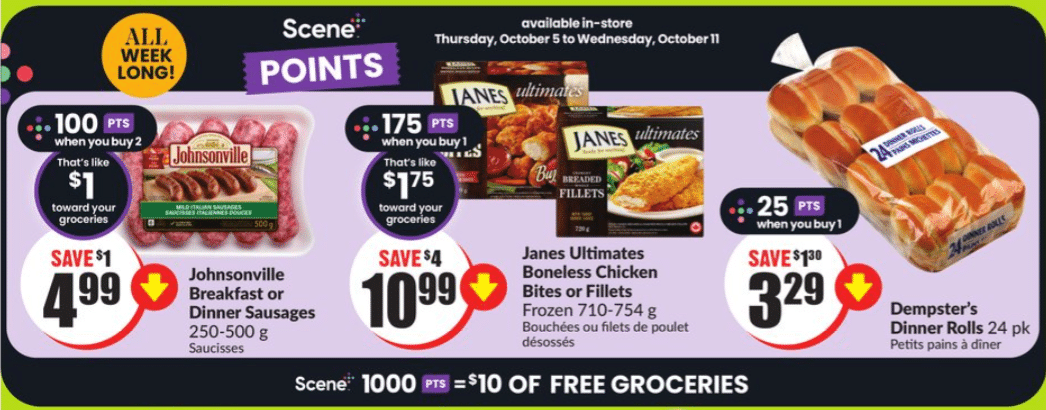 - 5 Scene+ points per dollar spent at all other eligible grocery stores