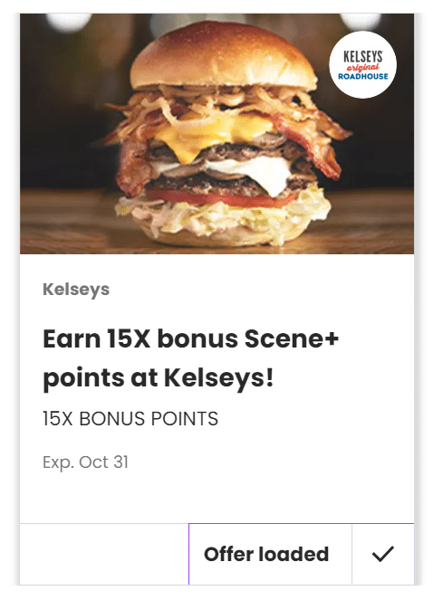 For instance, you could load the 15x offer at Kelsey’s Original Roadhouse and earn 15 Scene+ points per $3 spent. Plus, these earnings are on top of what you earn with the Scotiabank Gold American Express Card, with which you’ll get another 15 Scene+ points per $3 spent.