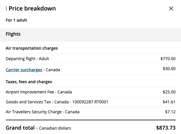 In the above screenshot, the total cost of the ticket is $873.73; however, you’d only be eligible for SQC on $800 (the Air Transportation Charges, which include the base fare and carrier surcharges), since you don’t collect SQC on third-party taxes and fees.