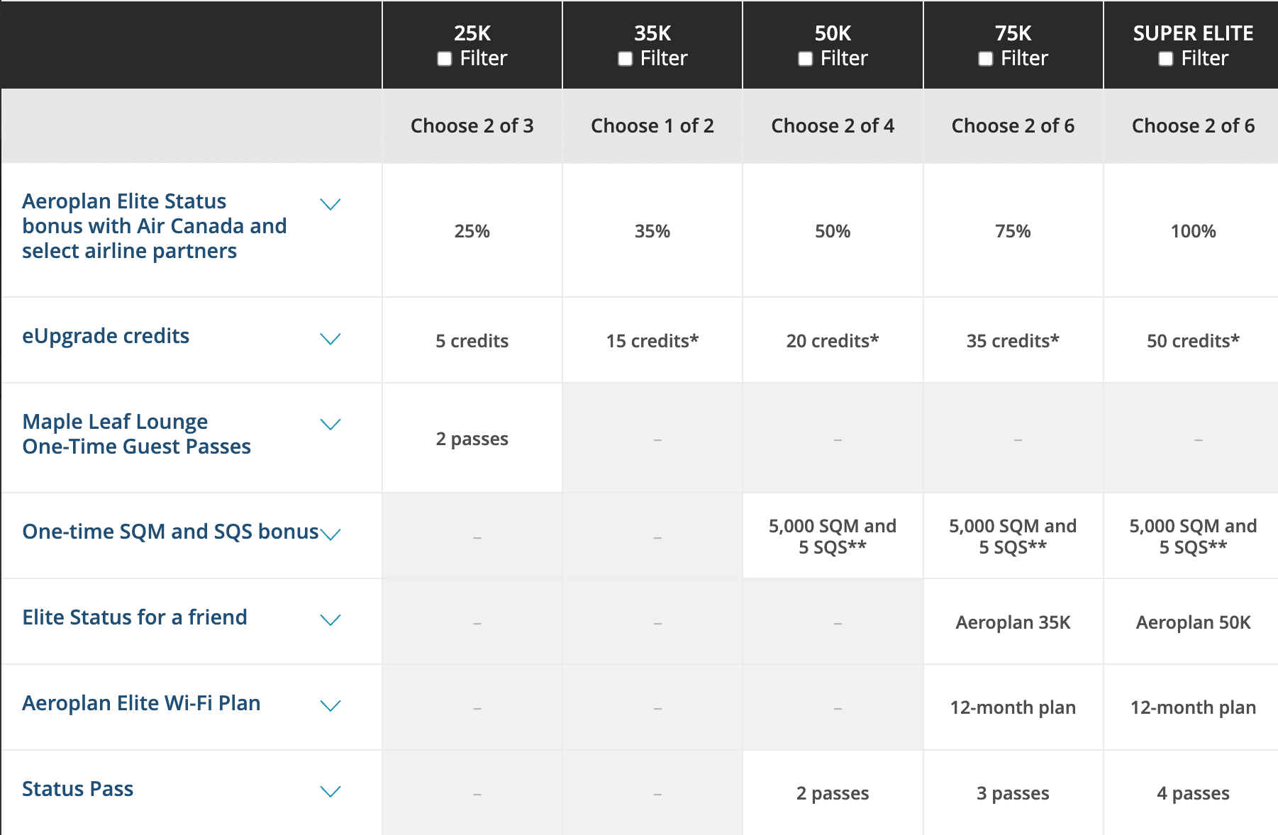 As you can see, Aeroplan 25K, 50K, 75K, and Super Elite members get to choose two Select Benefits from the available options, while 35K members can choose one of two options.