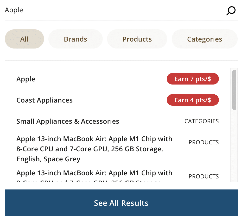 The main page of the Aeroplan eStore portal has featured stores and categories if you’re just browsing and need some ideas. But if you already have stores or items in mind, you can either look by category or search for specific stores, such as Apple, through the bar at the top.