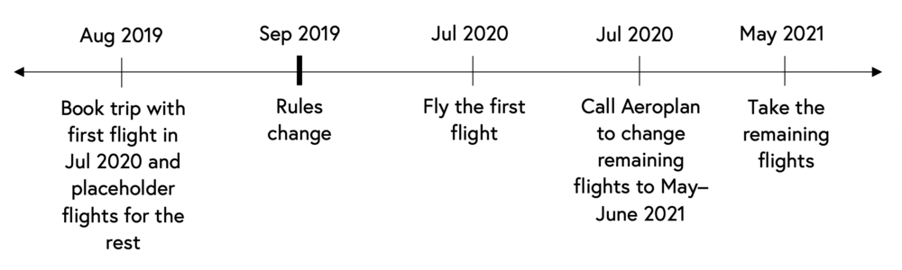 For example, imagine that you booked the trip on August 31, 2019, with the first flight taking place on May 31, 2020, and the remaining flights not scheduled until later in the year. After you take the first flight in May 2019, you call Aeroplan to change the ticket – at this point, your ticket under the old rules can be extended as far as May 31, 2021!