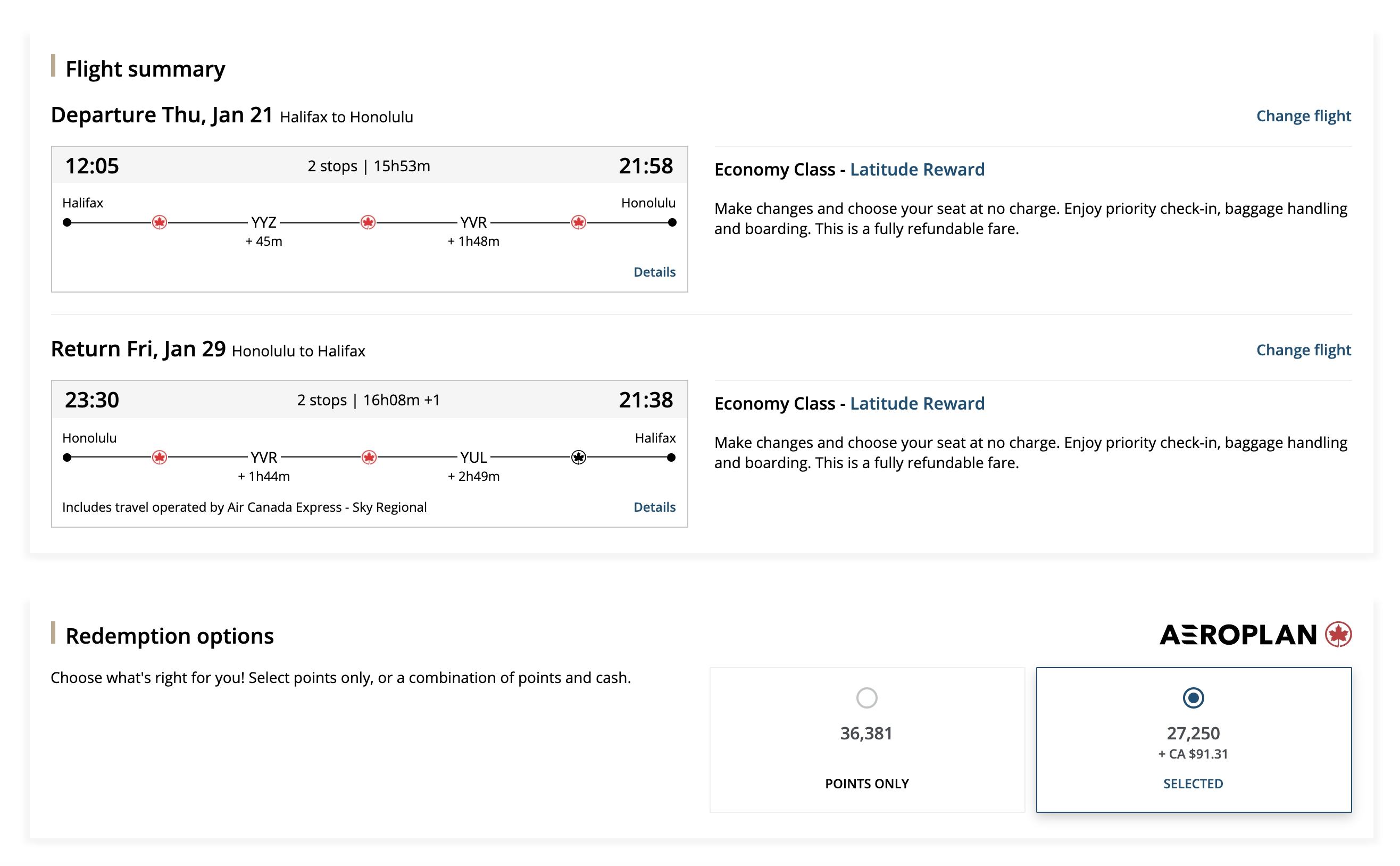 If you’ve earned Priority Reward vouchers as a base-level Aeroplan 25K member, you’d be looking at flights within Canada and the US in economy class only. You could apply these vouchers on a flight to, say, Hawaii in order to maximize the total value.