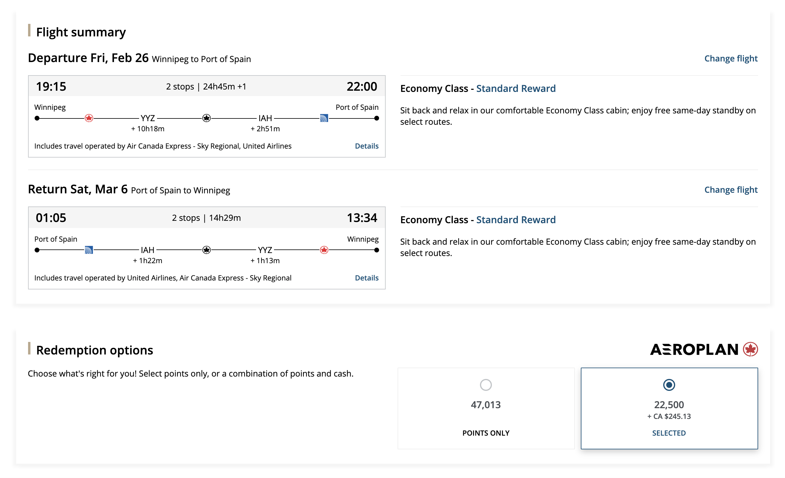 For example, an Aeroplan 35K or 50K member is eligible to redeem Priority Reward vouchers on flights within North America (which, in this case, refers to Canada, the US, Mexico, Central America, and the Caribbean) in economy class or premium economy.