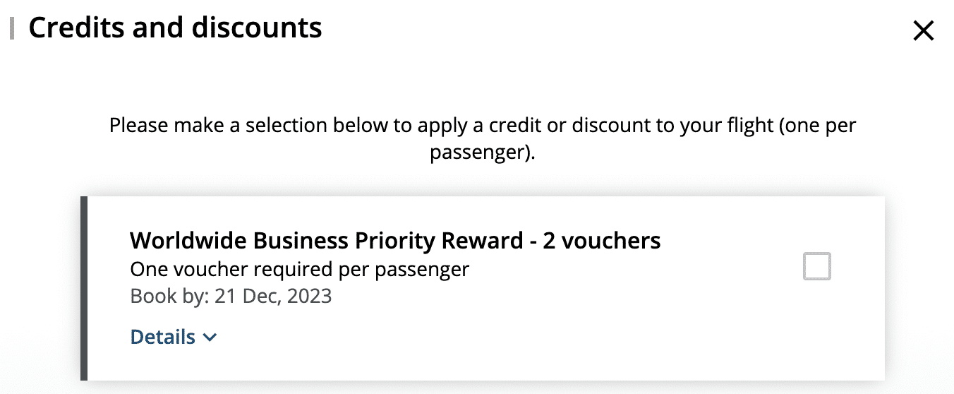 Each Priority Reward voucher entitles the holder to a 50% discount on the number of points required for an eligible itinerary for one passenger booked out of the voucher holder’s account.