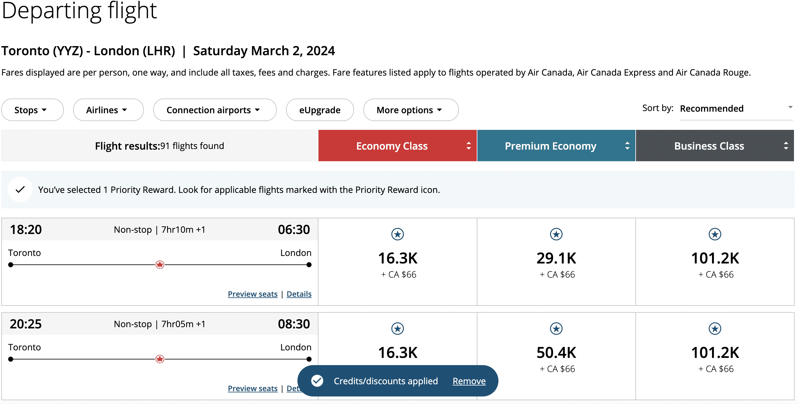 Once you’ve earned a Priority Reward, you can easily redeem them online or over the phone with the Aeroplan call centre.