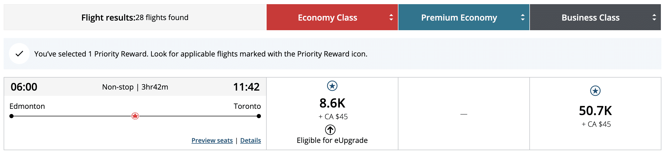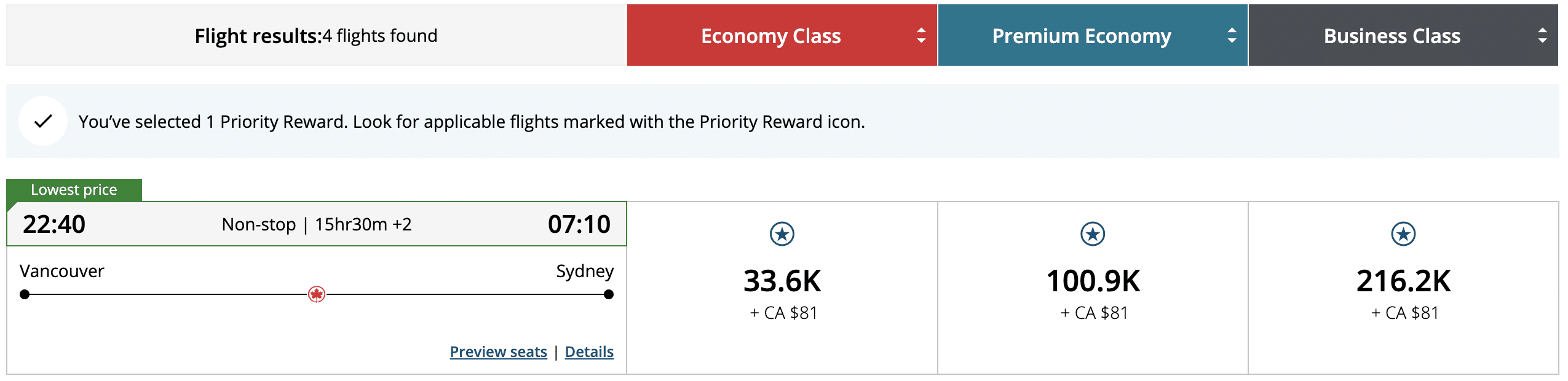 Your search results will then repopulate, and any eligible flights will cost 50% fewer points than searching without Priority Rewards applied. A star above the price indicates that you’re getting 50% off.