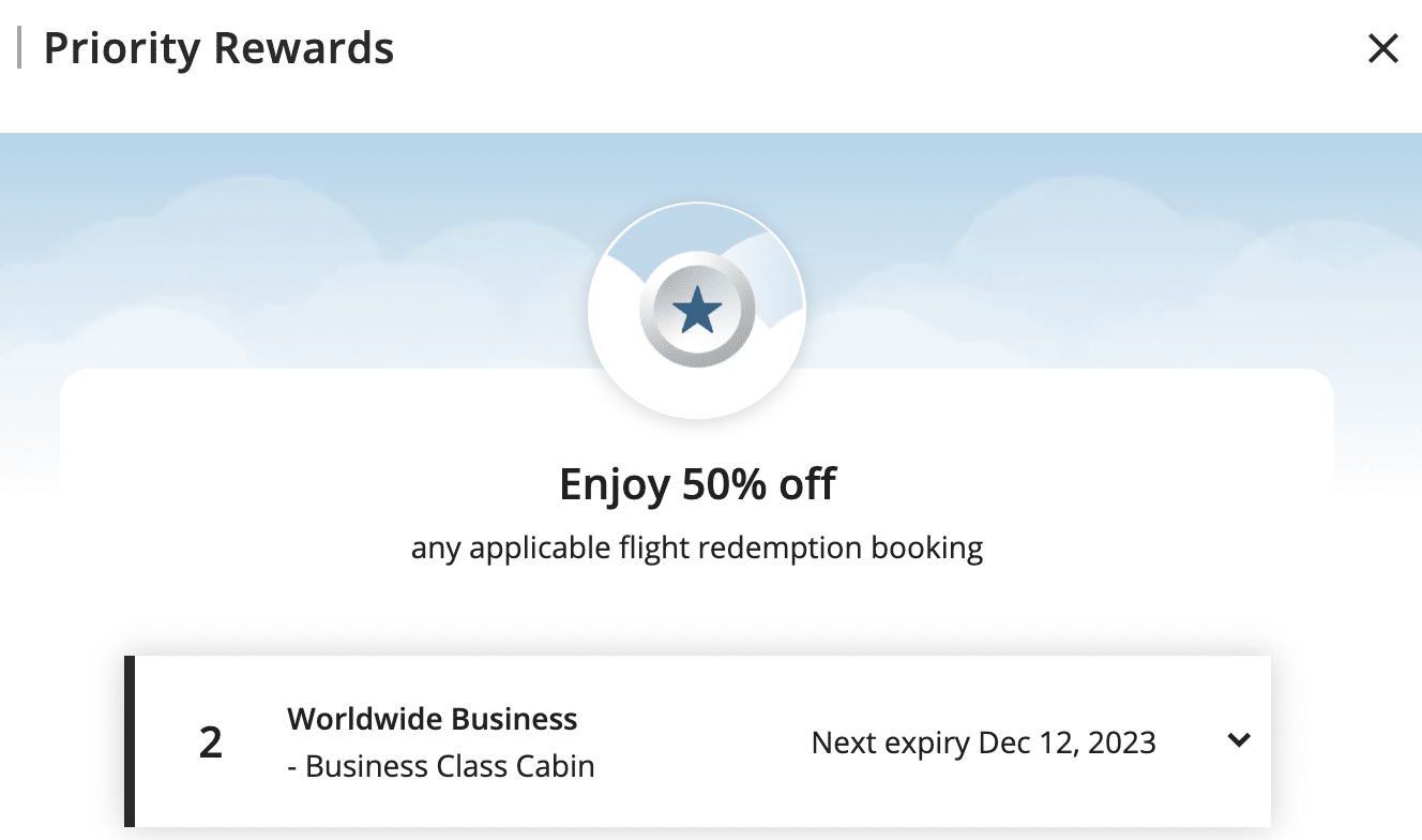In this case, you can construct your ideal business class itinerary around the world on any mix of Air Canada and Aeroplan’s partner airlines, and then apply a Priority Reward voucher to slash the cost of the award by a half.
