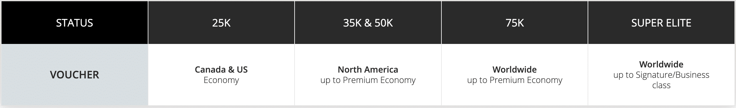 Your Aeroplan Elite Status at the time of earning a Priority Reward voucher determines which set of flights are eligible for you to redeem that voucher and unlock a 50% discount on the award redemption, detailed as follows:
