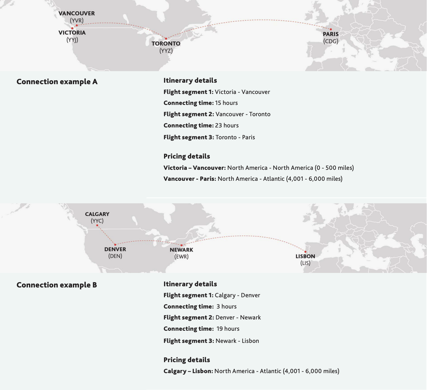 When travelling from one of Aeroplan’s four geographic zones to another, connecting through a third zone is generally permitted if it meets all of the other conditions.