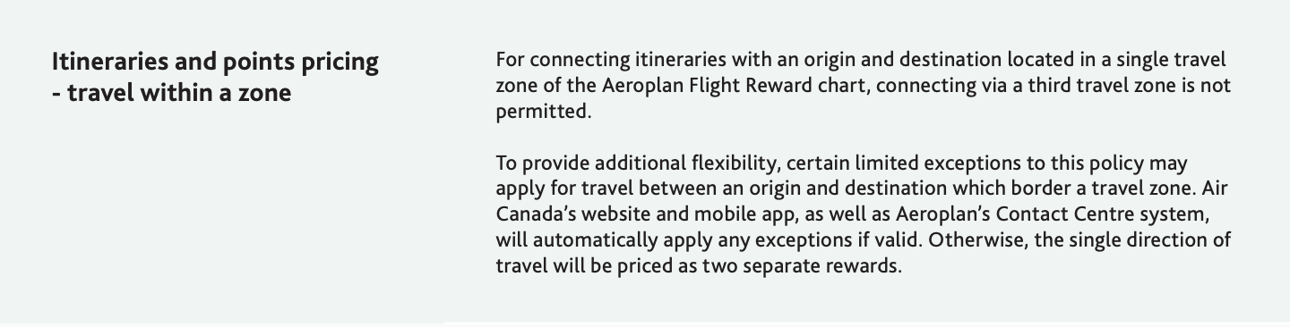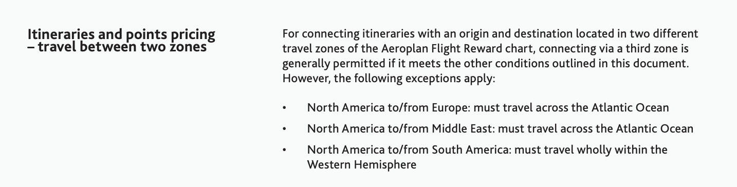 When travelling within one of Aeroplan’s four geographic zones, connecting via a third zone generally isn’t allowed. However, there are “certain limited exceptions” to provide additional flexibility when one of the endpoints border another zone.