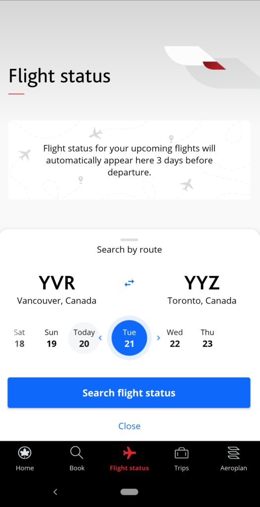 The easiest way to find out this information is on the Air Canada app. From the home screen, head to the “Flight Status” tab and search for your flight.