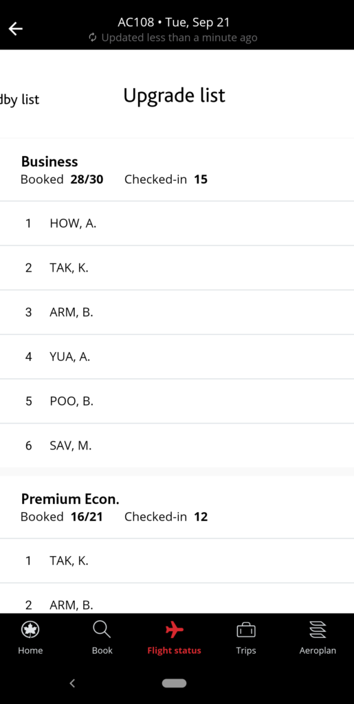 Here, you’ll see the names and rankings of everyone who is waiting for an upgrade. In a three-cabin aircraft, you’ll see both business class and premium economy lists, and in a two-cabin aircraft, you’ll only see a list for business class.