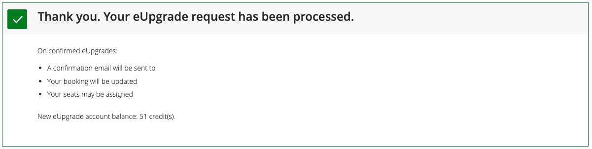 Click on “I accept, purchase” at the bottom of the page, and your eUpgrade request will be processed. A confirmation page confirms what has just transpired, and you are now free to select your shiny new seat in your better class of service.
