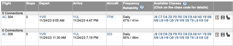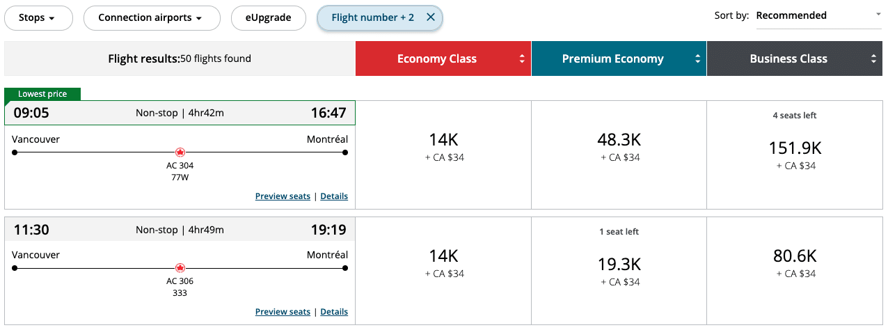 If you don’t have an ExpertFlyer subscription, you can find this same information by using the search result filters on Air Canada’s website.