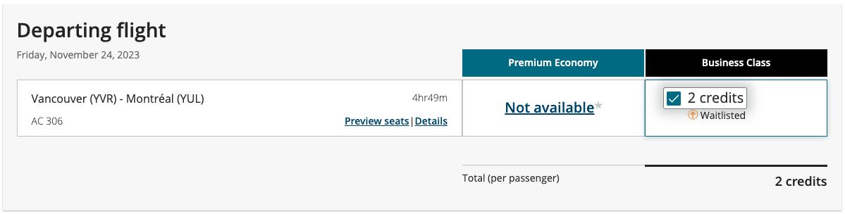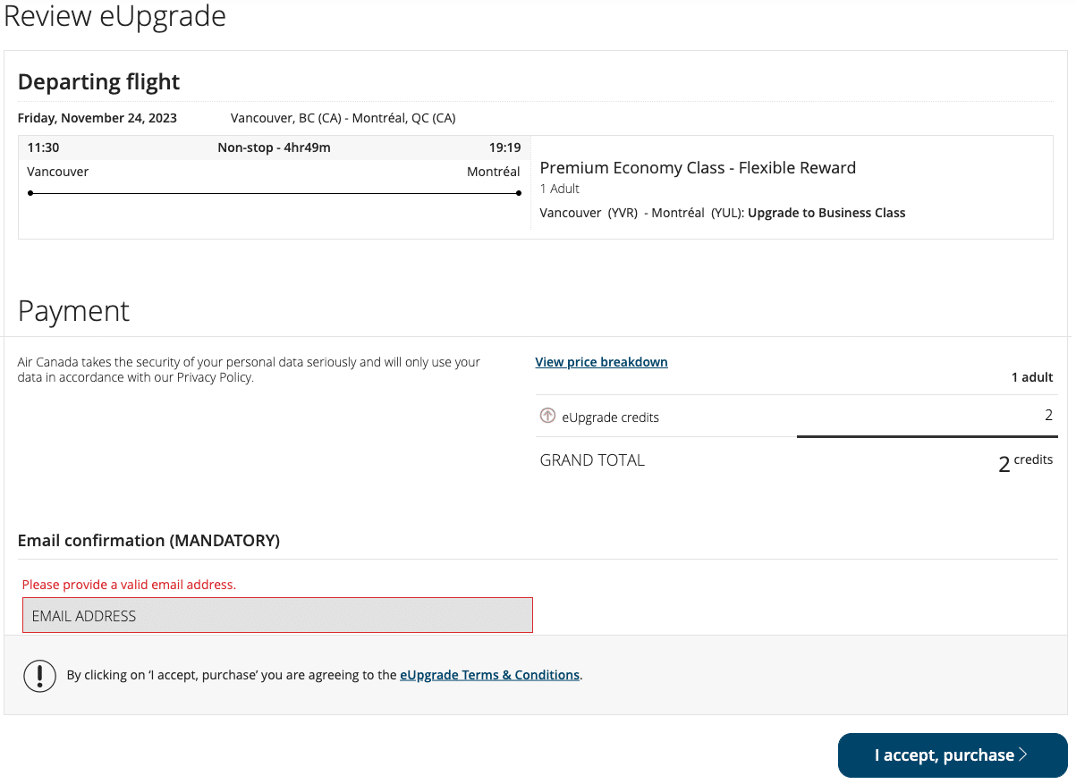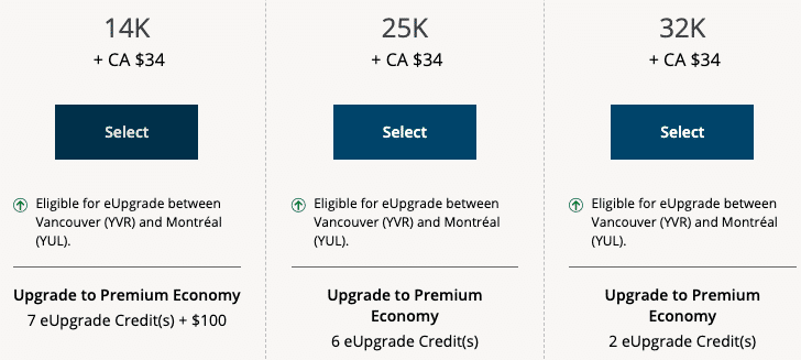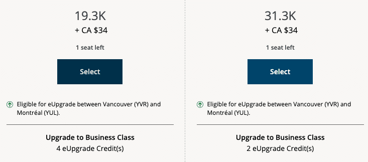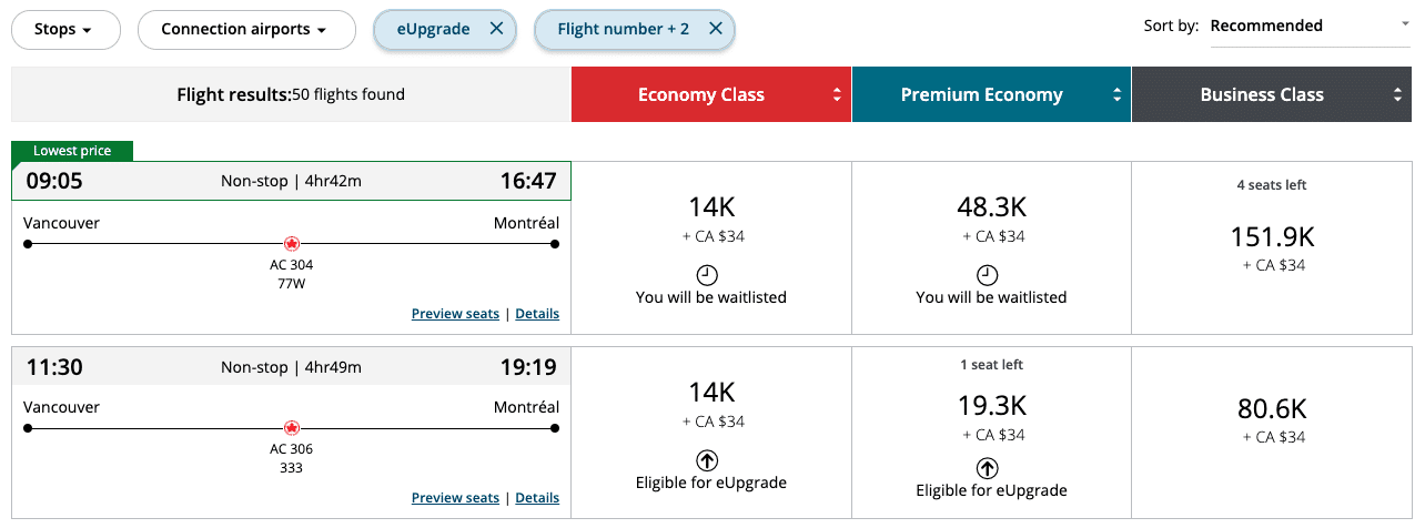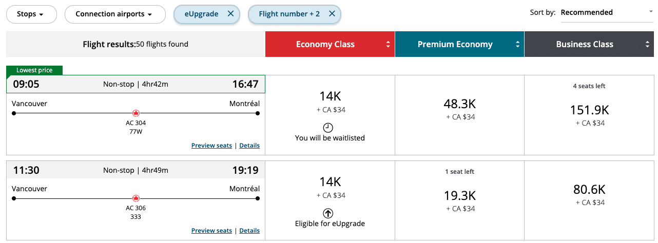 Suppose you’d like to fly from Vancouver to Montreal, and you have some eUpgrades valid for your ideal travel date of November 24. You’d be happy with either premium economy or business class, and you have 30 eUpgrades in your account that are valid for the date of travel.