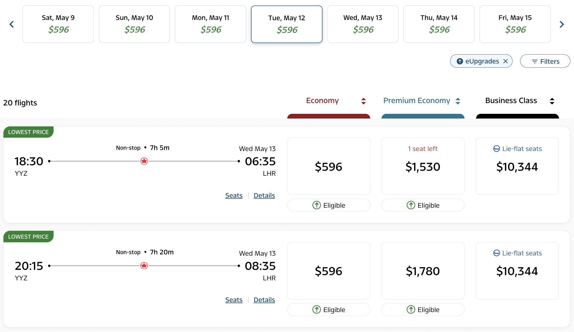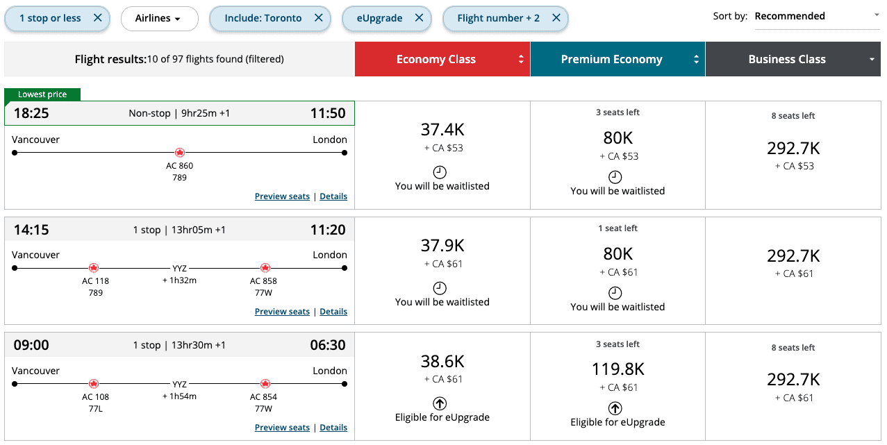 The third option, which would take you on AC108 and AC854 to London, shows “Eligible for eUpgrade” in the results.