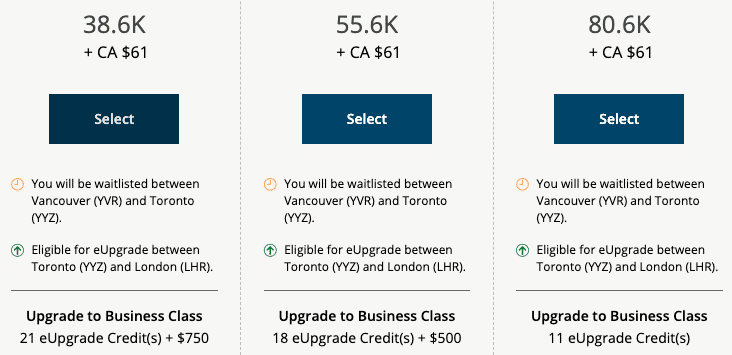 For example, suppose you’d like to fly from Vancouver to London, and you have some eUpgrades available that are valid for the date of travel.