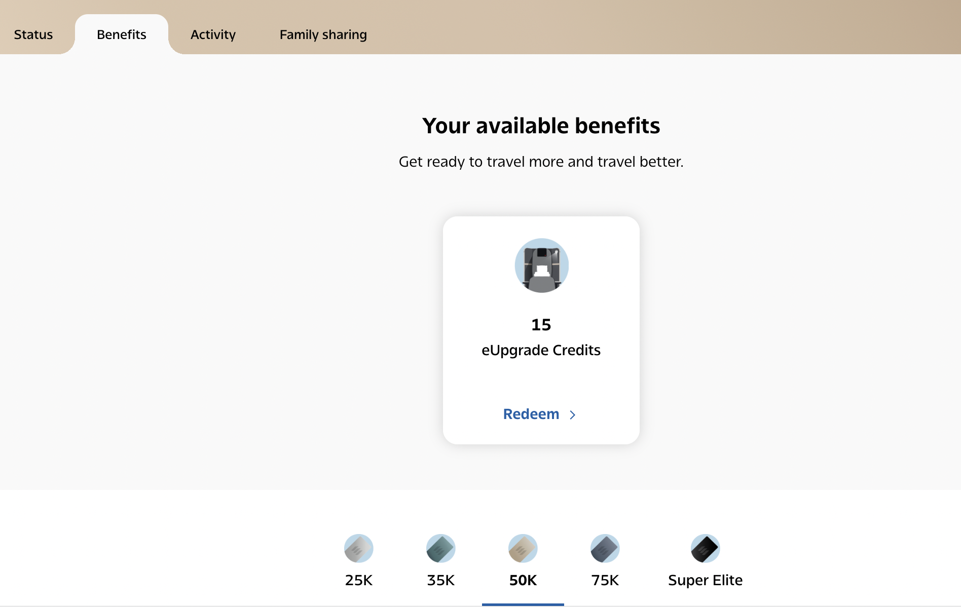 As you accumulate Status Qualifying Credits throughout the year, you can also unlock more eUpgrades through Milestone Benefits. Depending on the threshold you reach, you could get an allotment automatically, or you can choose them as a selection over other choices.
