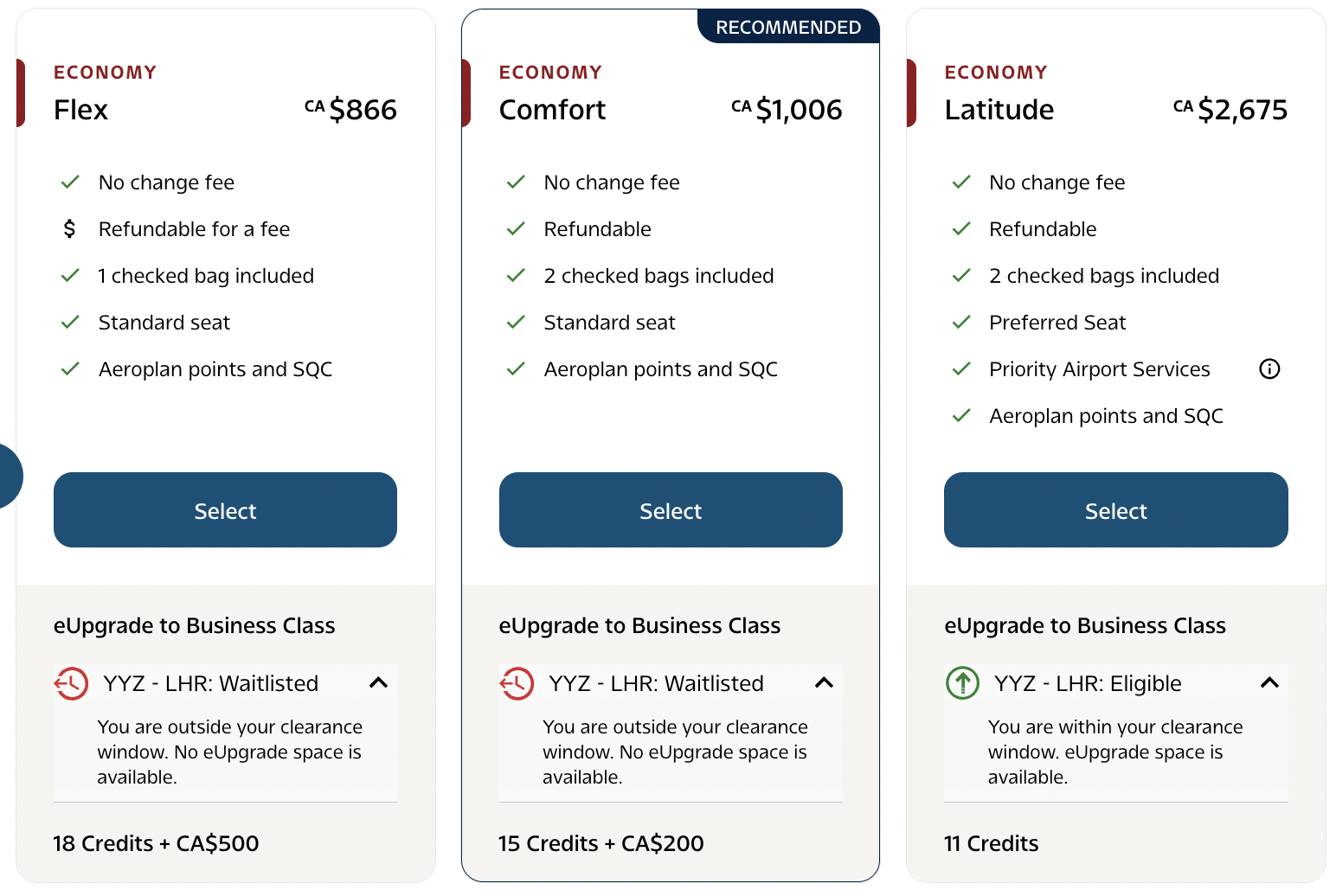 This is more often the case with cash fares than with Aeroplan points. The difference between an Economy (Flex) and an Economy (Latitude) fare in cash is often significant, while the difference between an Economy (Flex) and an Economy (Latitude) fare with Aeroplan points isn’t proportionally as significant.
