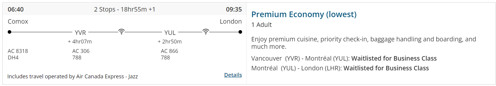 In this situation, you could eUpgrade to business class on the Toronto–London segment, but you’d be waitlisted between Vancouver and Toronto.