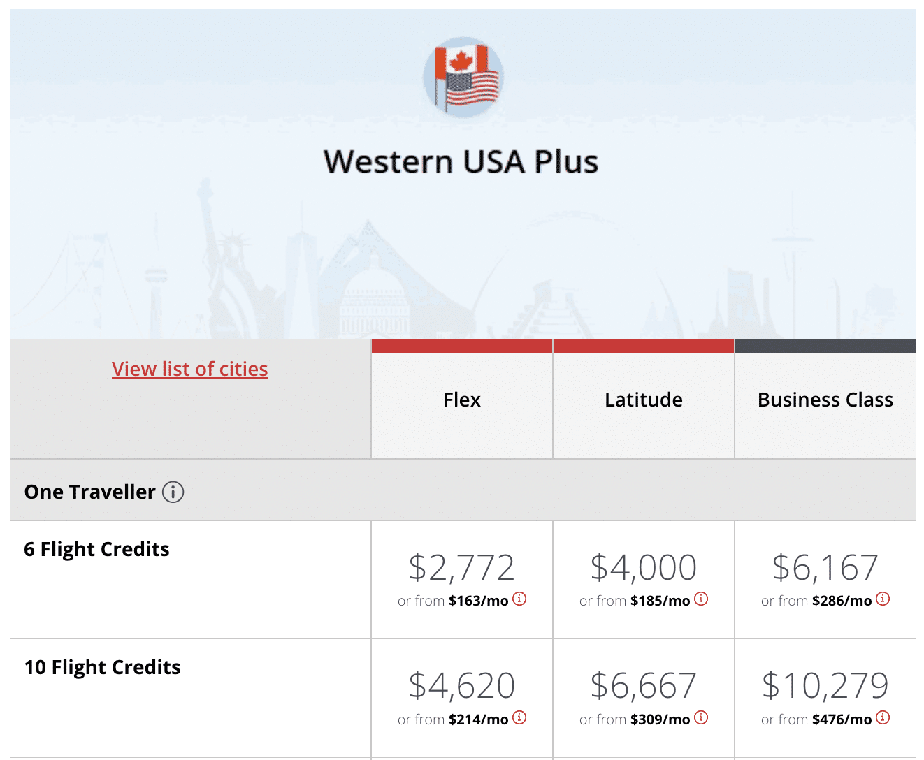 For example, suppose you’re based in Edmonton, and fly to Los Angeles at least five times per year. You might consider buying a Western USA Plus Flight Pass at the following prices (subject to change):