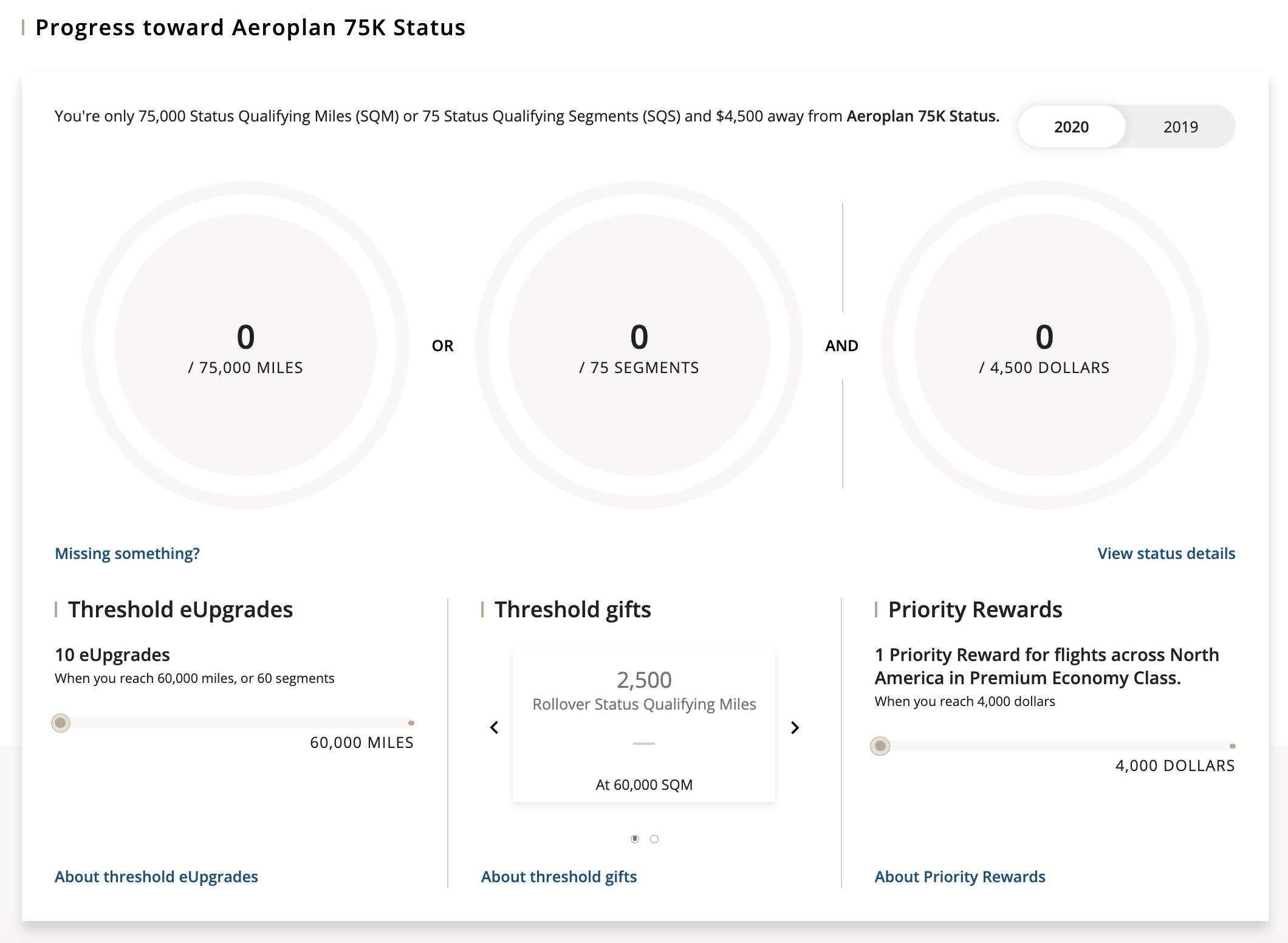 Here, you can get an at-a-glance view of your member information, Aeroplan Elite Status, credit card ownership, and any benefits you have in your account currently (such as eUpgrades and Priority Rewards).