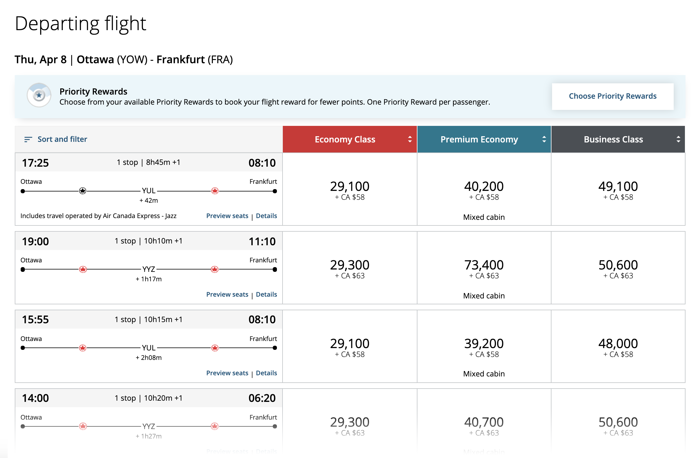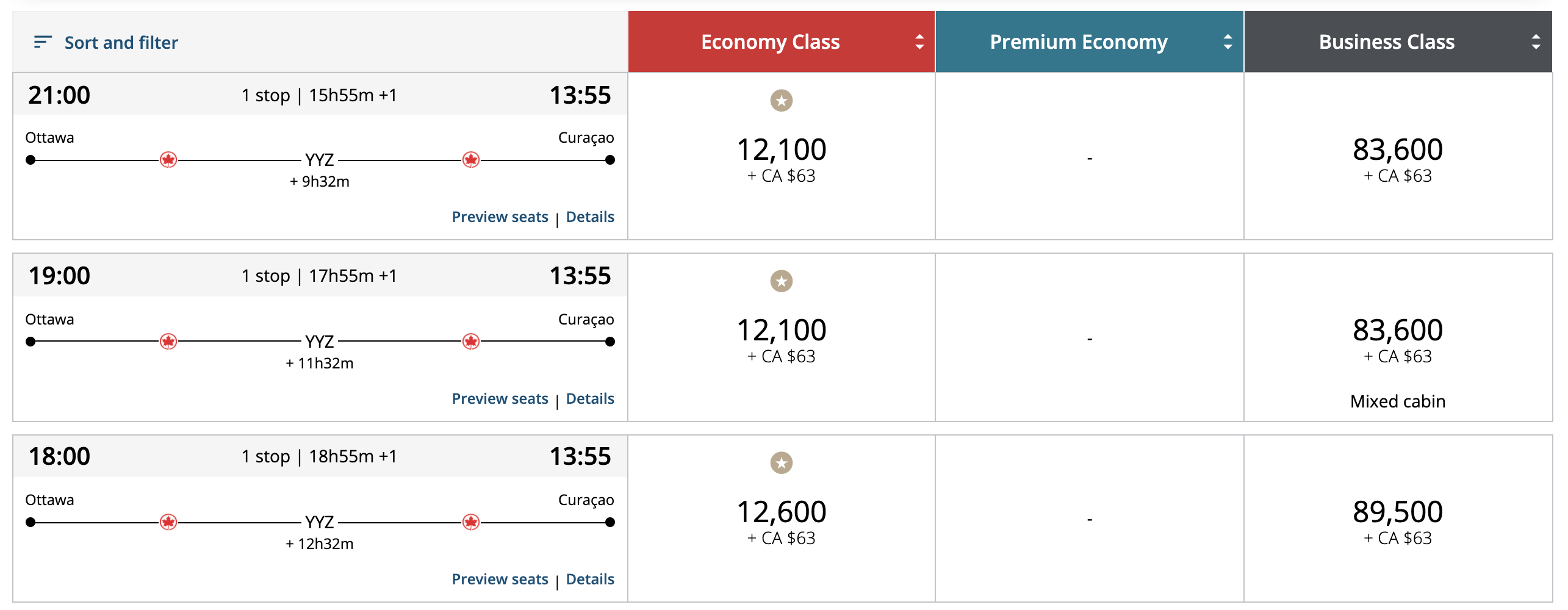 Upon applying my Priority Reward on a search for Ottawa–Curaçao, then, the economy class awards get halved, but the business class awards do not.