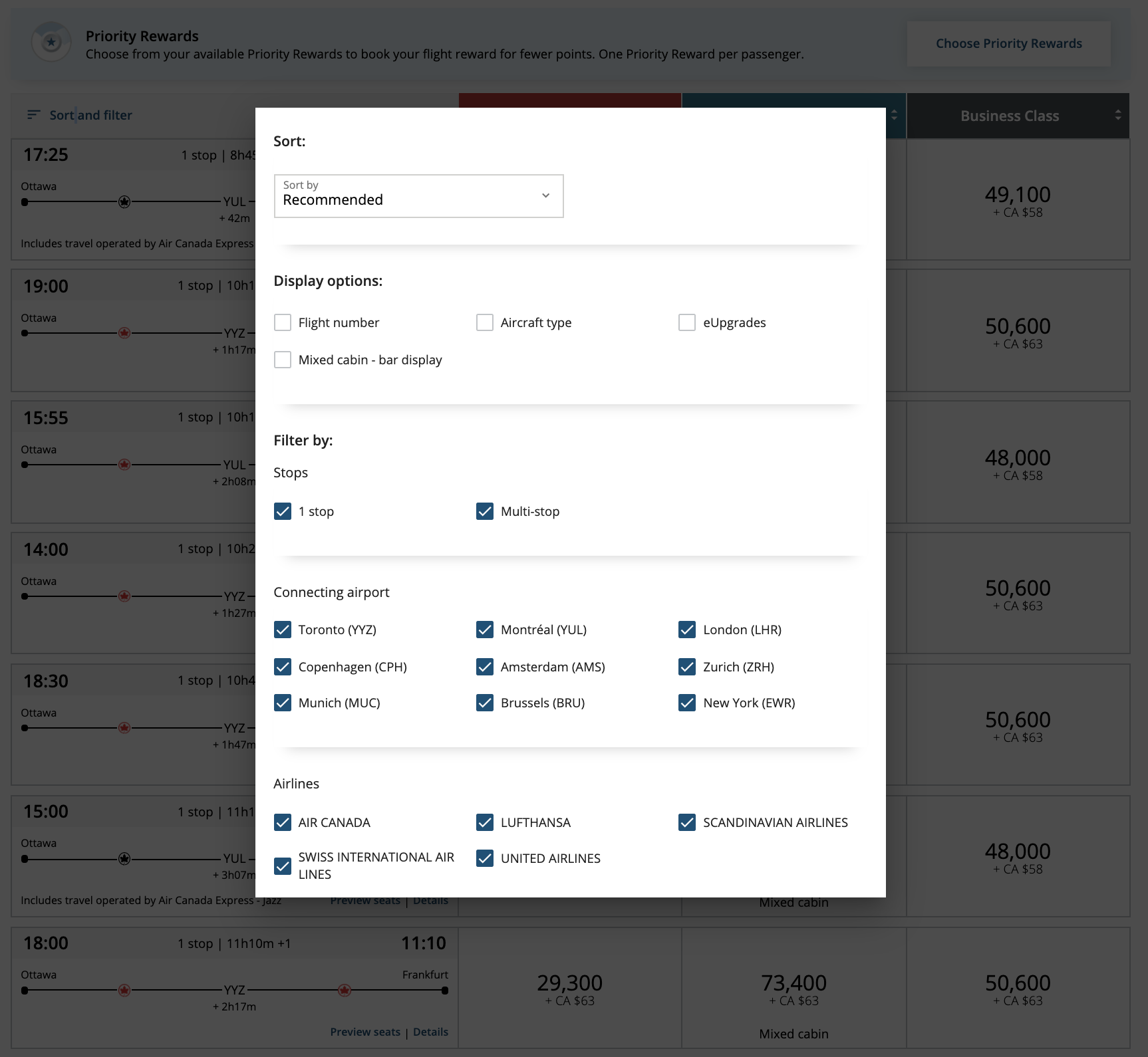 Then, by clicking “Sort and Filter” in the top-left corner, you can unlock a wider range of sort and filter criteria, such as the number of connections, the connecting airports, and the airlines involved in your itinerary. You can also toggle to display the aircraft type, flight number, information about eUpgrades, and the “bar display” for mixed-cabin itineraries.
