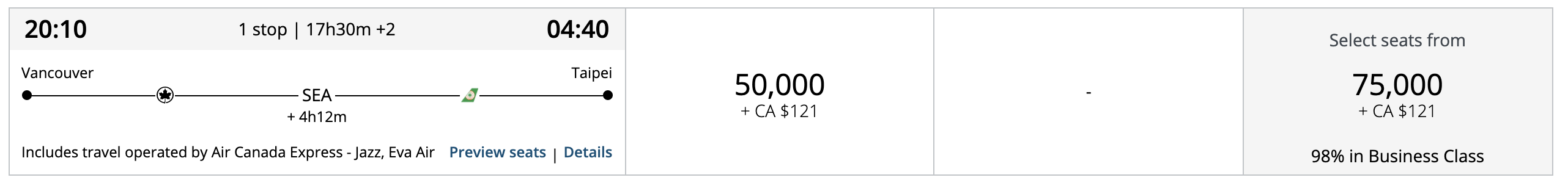 Meanwhile, another test for Vancouver–Taipei (stopover)–Bangkok on EVA Air and Thai Airways business class resulted in the expected amount of 90,000 Aeroplan points: 85,000 Aeroplan points for the routing based on the Flight Reward Chart, plus 5,000 Aeroplan points for the stopover.