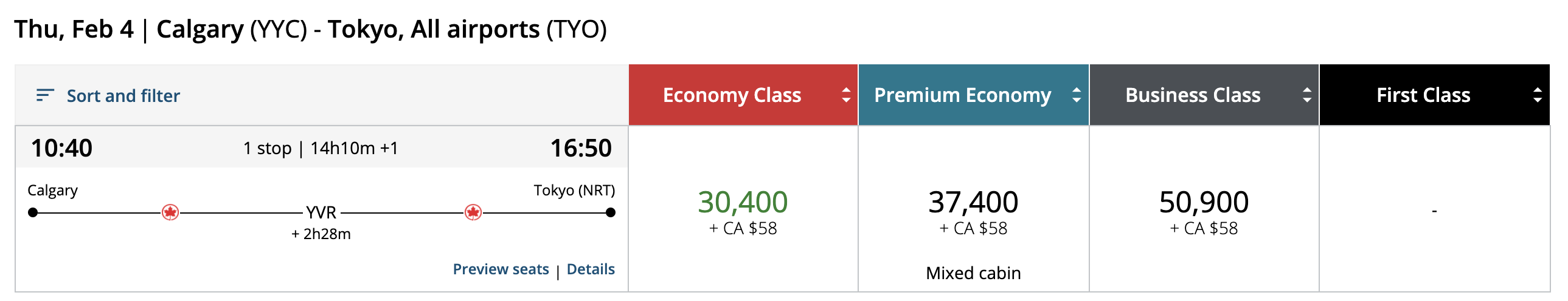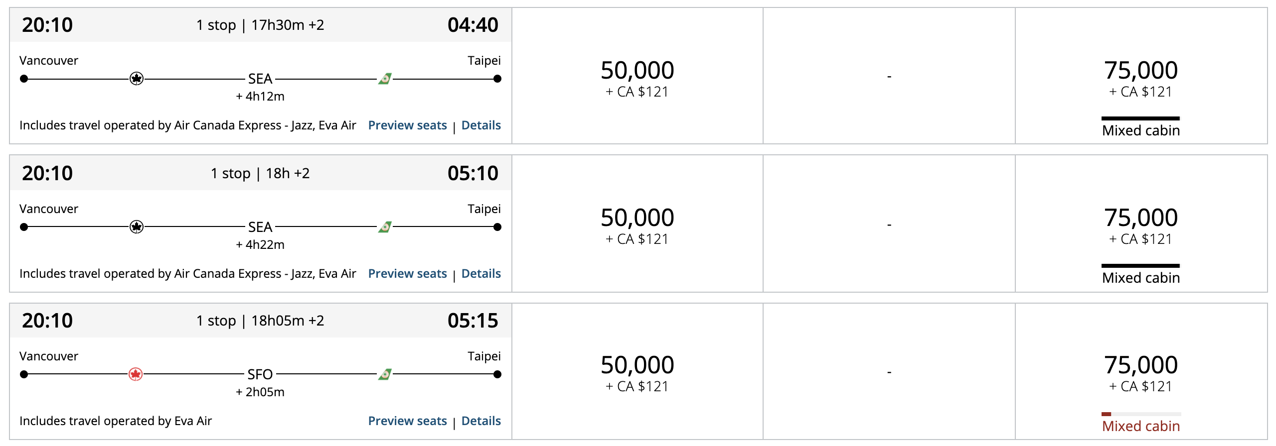 Then, let’s talk about mixed-cabin itineraries. One of the greatest frustrations with the old Aeroplan was the fact that the search engine would often populate mixed-cabin itineraries with a short flight in business class and the long segment in economy class. Now, the “true” composition of mixed-cabin itineraries is displayed much more transparently.