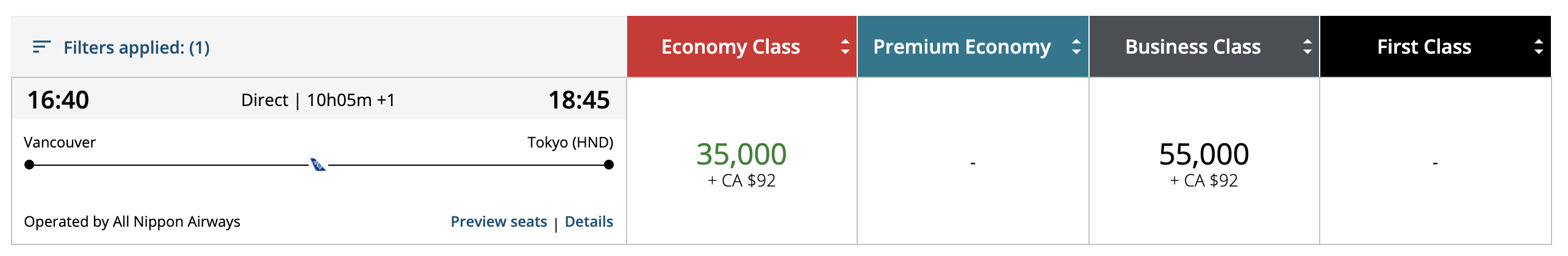 One of the best examples is Vancouver–Tokyo on ANA business class, which is bookable for 55,000 Aeroplan points one-way, compared to 75,000 miles before: