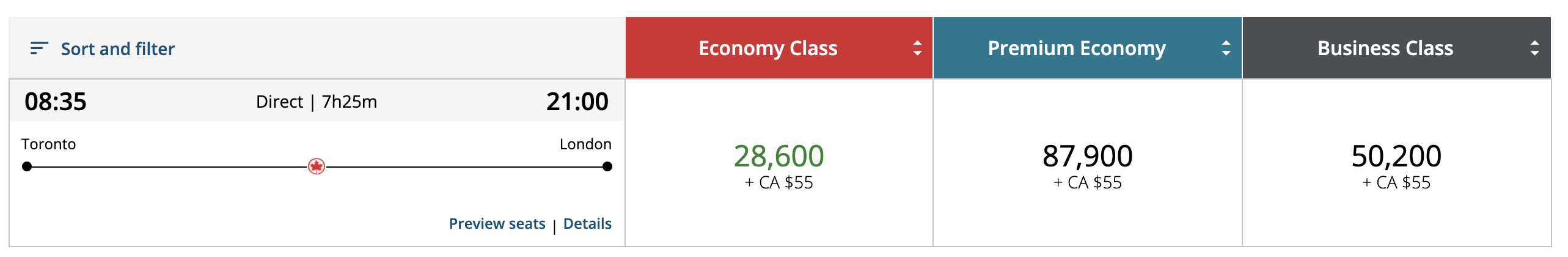 For example, in the examples above we saw Toronto–London business class seats available for 50,200 Aeroplan points. When I log in as an Aeroplan 50K member with a core credit card, I see the following instead:
