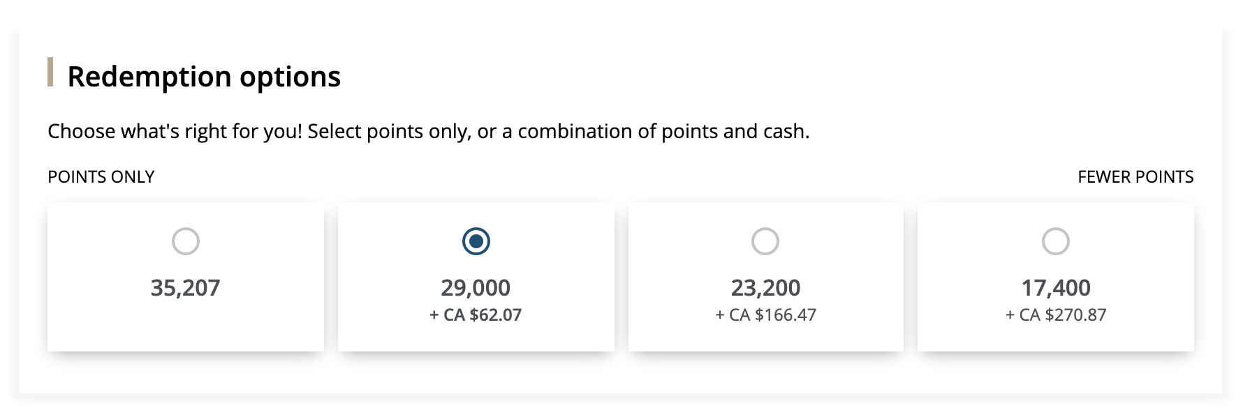 If you select the “Points Only” option, all of your taxes and fees get converted into a points amount at 1cpp, and those points are added to your total. Meanwhile, if you move in the direction of “Fewer Points”, you get to pay either 80% or 60% of the total points cost, and the remaining points get converted into a cash amount at 1.8cpp and added to your cash co-pay amount.
